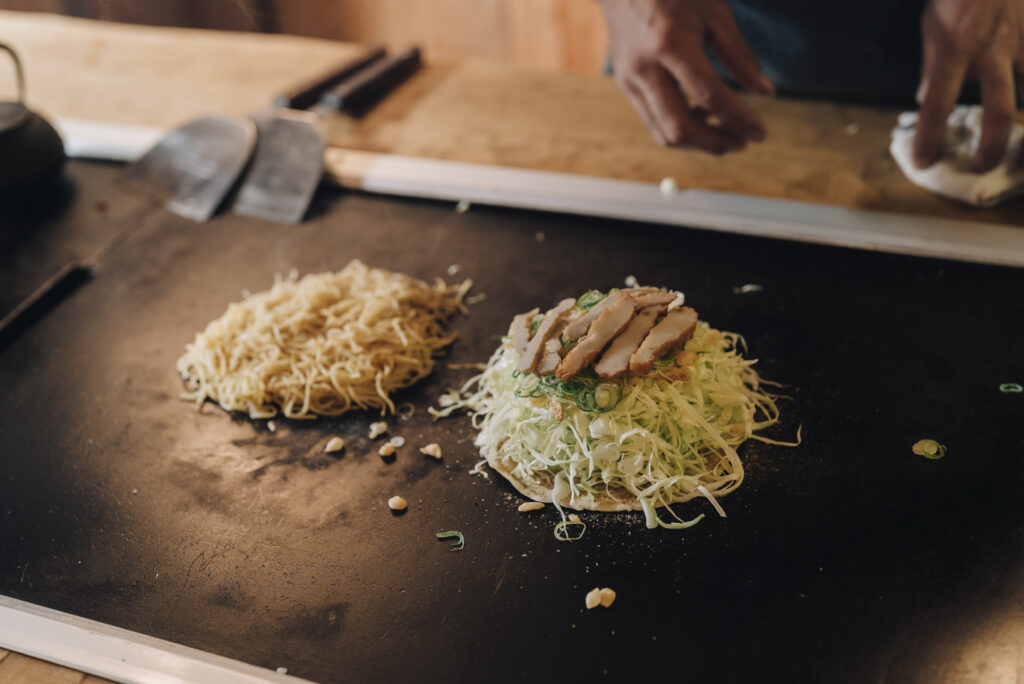 鉄板でふっくりと焼き上がるお好み焼きは、ほのかに練り物の魚の風味が広がります。